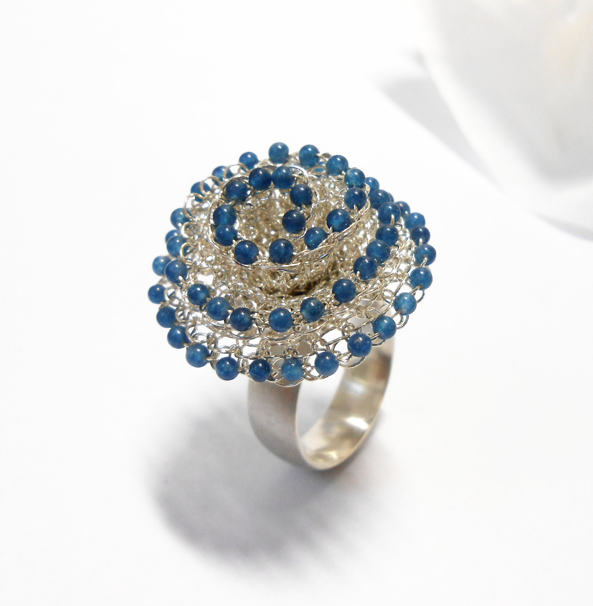 Blütenring gestrickt, Silber 925/000, Amethyst, Perlen